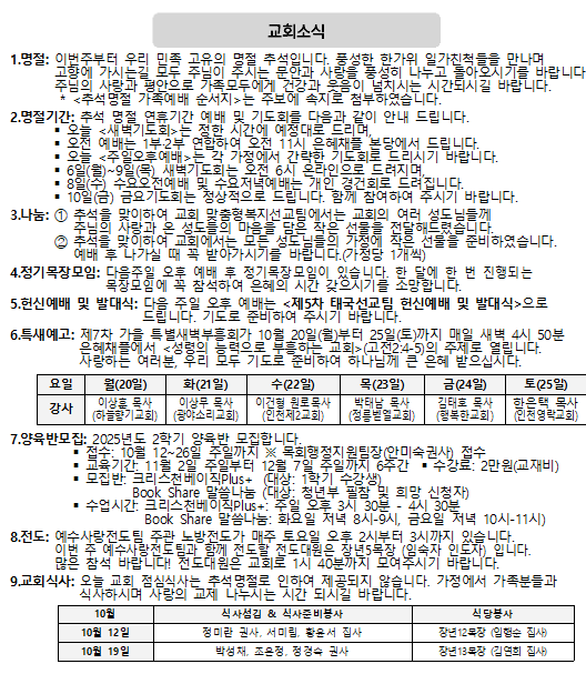 2025년 10월 12일 교회소식
